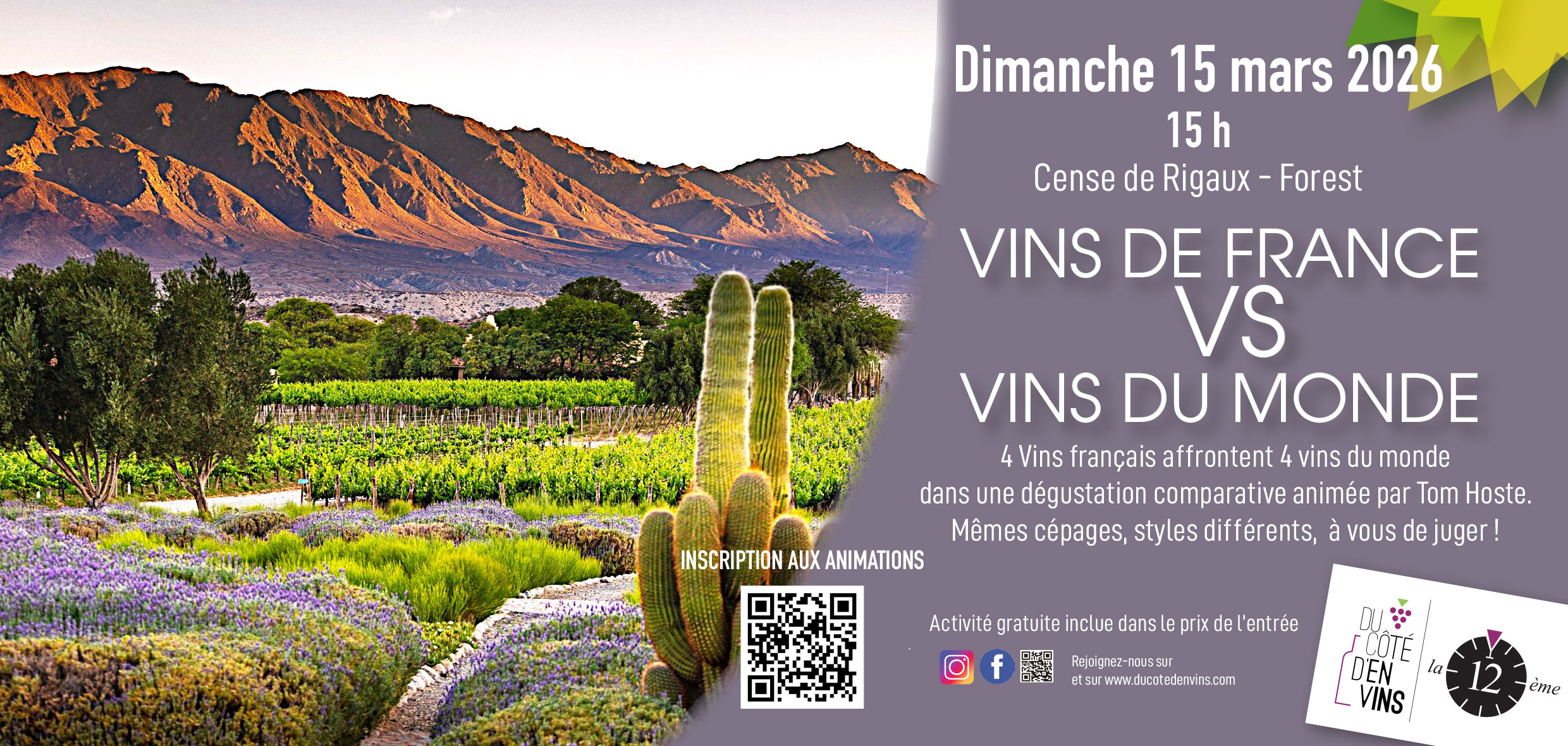 15 h 00 : Vins de France VS vins du monde.4 Vins français affrontent 4 vins du monde 4 Vins français affrontent 4 vins du monde dans une dégustation comparative animée par Tom Hoste. Mêmes cépages, styles différents, à vous de juger !